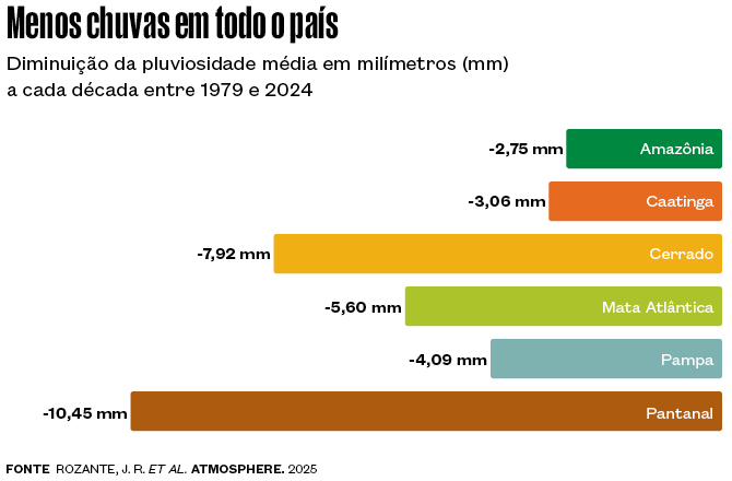 Segundo o trabalho na Atmosphere, houve uma redução média de 10,45 milímetros (mm) na quantidade de chuva que caiu a cada década no bioma ao longo dos 45 anos analisados. No Cerrado, o segundo ecossistema mais afetado por essa tendência, a queda foi de 7,92 mm por década. Nos demais biomas, a diminuição de precipitação variou de 2,75 mm a 5,60 mm. Com frequência, o Pantanal já aparece como o segundo bioma com menor índice de pluviosidade anual, com chuvas totais entre 800 e 1.200 mm, menos seco apenas do que a Caatinga. É uma ironia, e um sinal de alerta, para um ecossistema tão associado à dança das águas em seus rios e lagoas.
